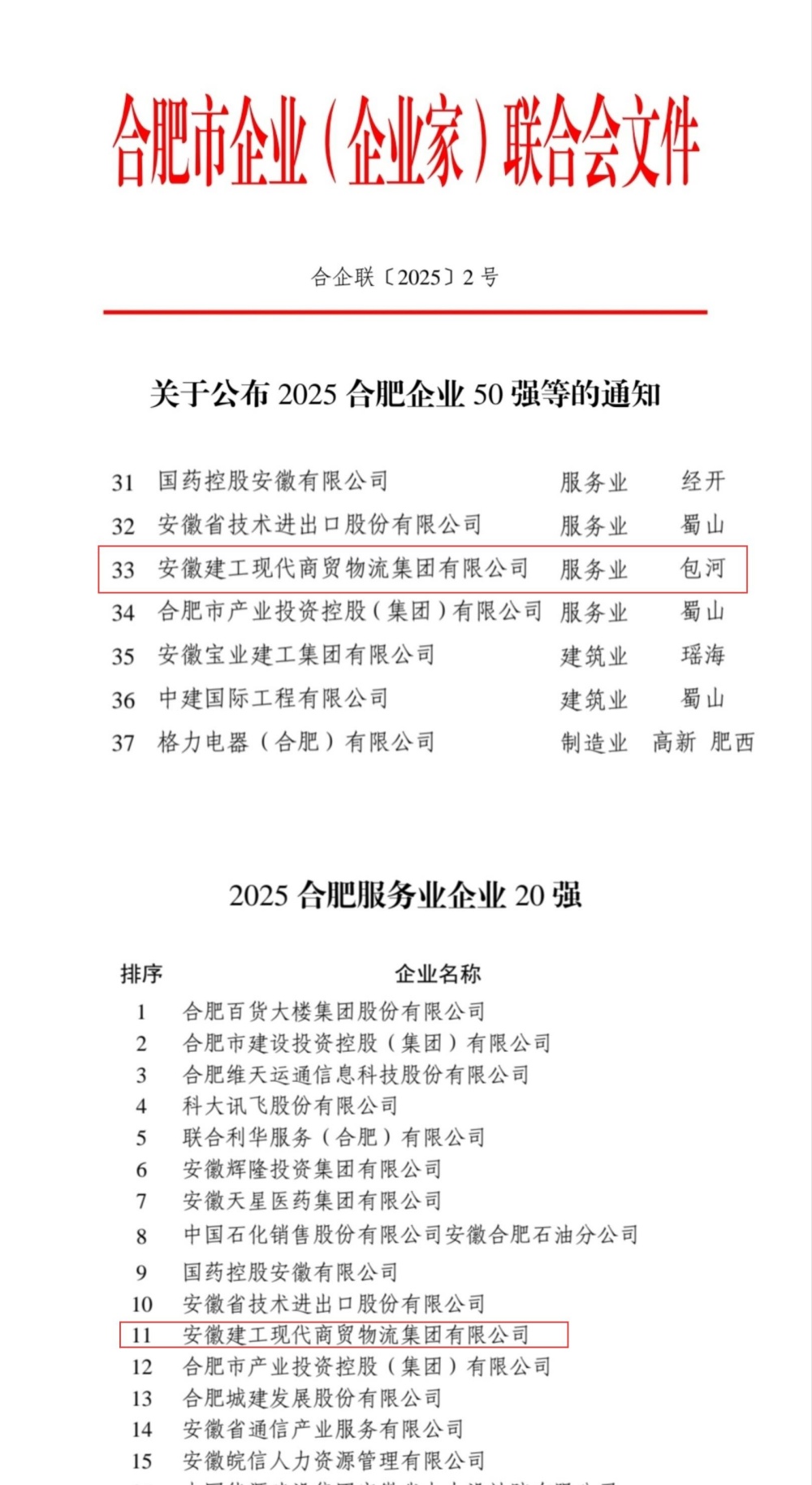 五年蟬聯(lián)強(qiáng)企榜 轉(zhuǎn)型升級啟新程? | 建工商貿(mào)物流再登“合肥企業(yè)50強(qiáng)”“合肥服務(wù)業(yè)企業(yè)20強(qiáng)”榜單